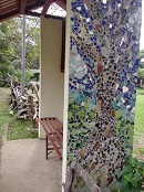 One example of art outlasting the student’s assignment is the bus stop in Monteverde’s small commercial district. During the 2018-19 school year, renowned local artist Paul Smith paired up with Sarah Heithaus, and MFS GAP year student (and, really, the rest of her family) The result of their collaboration is a beautiful mosaic that will decorate the side of the bus stop near Monteverde’s center for years to come. In another installation on the outside wall of a bank in Santa Elena, students Elli Gabrielson and Melanie Garcia Quesada brought their art skills to the community in collaboration with Fondo Comunitario.